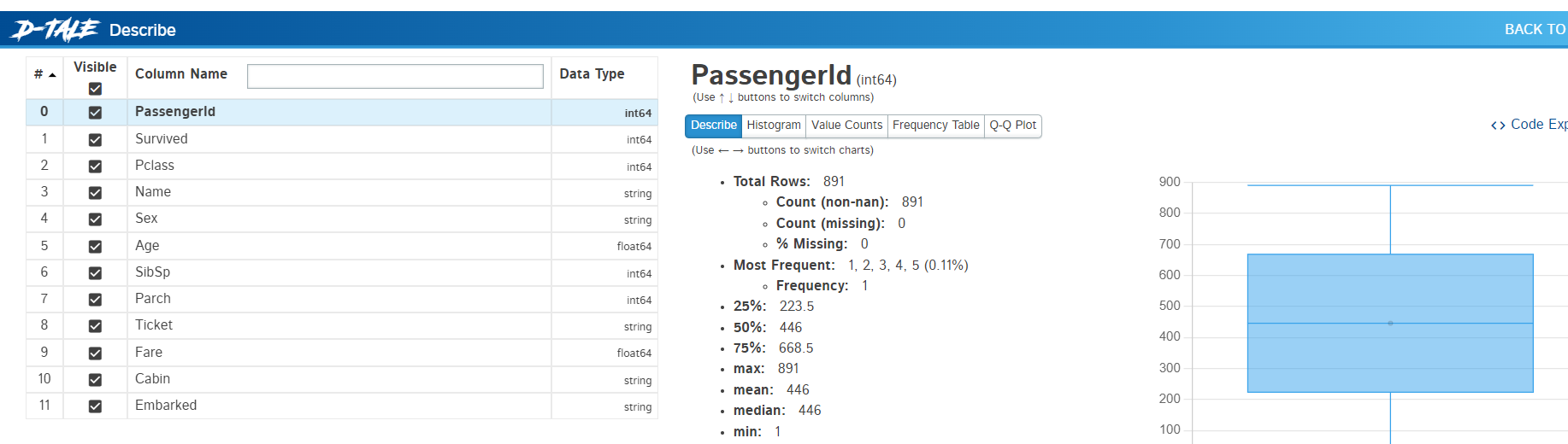 pandas 데이터를 확인할때, matplotlib을 cli로 코딩해서 쓰는 방식이 너무 한심하다는 생각을 하다가, 이리저리 찾은 라이브러리 dtale. 이거 말고 pandasgui도 있으나 일단은 이게 더 나아보인다.