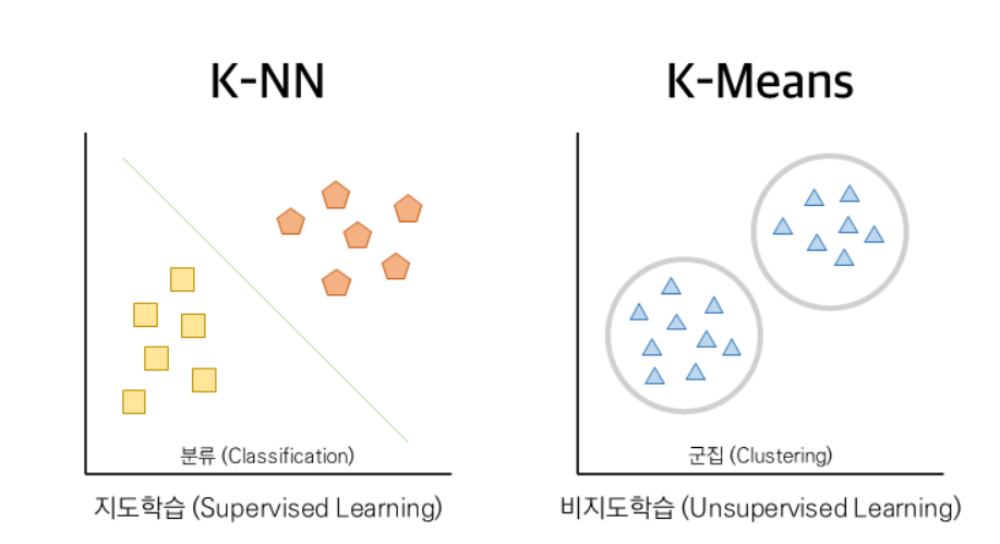 비지도학습 k-mean knn과 유사하나 knn은 지도학습인 반면 k-mean은 비지도학습이며, 군집 알고리즘이다. knn은 타겟값, label을 기준으로 유클리디안 거리로 이웃을 찾는 반면, k-mean은 비지도학습이므로 데이터 중에서 centroids(중심값)을 찾아 중심값을 기준으로 군집시킨다. https://velog.io/@jhlee508/%EB%A8%B8%EC%8B%A0%EB%9F%AC%EB%8B%9D-K-%ED%8F%89%EA%B7%A0K-Means-%EC%95%8C%EA%B3%A0%EB%A6%AC%EC%A6%98 [머신러닝] K-평균(K-Means) 알고리즘머신러닝 비지도학습에 속하는 K-means 알고리즘은 K개의 군집(Cluster)로 묶는(Clusting) 알고리즘이다.velog.io https://b.. AI/model 2024.05.05